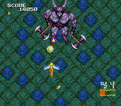 Despite its theme and setting, Sylphia plays like a vertically scrolling shooter. As in most games of this kind, the gameplay consists of shooting down waves of enemies, on the ground and in the skies. Sylphia can use four types of ranged attacks, which roughly correspond to other shooters' traditional weapons: fire blasts, laser, spreading fire, homing missiles. These weapons are displayed as colored orbs and must be collected. Power-ups can be collected for each type of attack. In addition, a devastating special attack can be stored (for one charge) and executed.