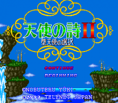 Tenshi no Uta II: Datenshi no Sentaku is not directly related to its predecessor story-wise (though it is set in the same universe, and some characters from the previous game make an appearance here). Graphically and gameplay-wise, it is nearly identical to it, with the exception of a few minor tweaks (such as characters regaining full health after level up): an archetypal Japanese-style RPG with random enemies, turn-based combat, linear story progression, and automatic character growth. Like the first game, Datenshi no Sentaku has a day and night cycle.
