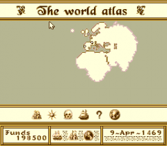 Atlas is a historical business and discovery game. The game is set in the 15th century. You are in a contract with the King of Portugal. For 10.000 gold a year you have to explore the area 1000 miles south of Portugal within five years. You are allowed to trade with the goods you discover, but all information gathered on your travels is property of the King of Portugal.