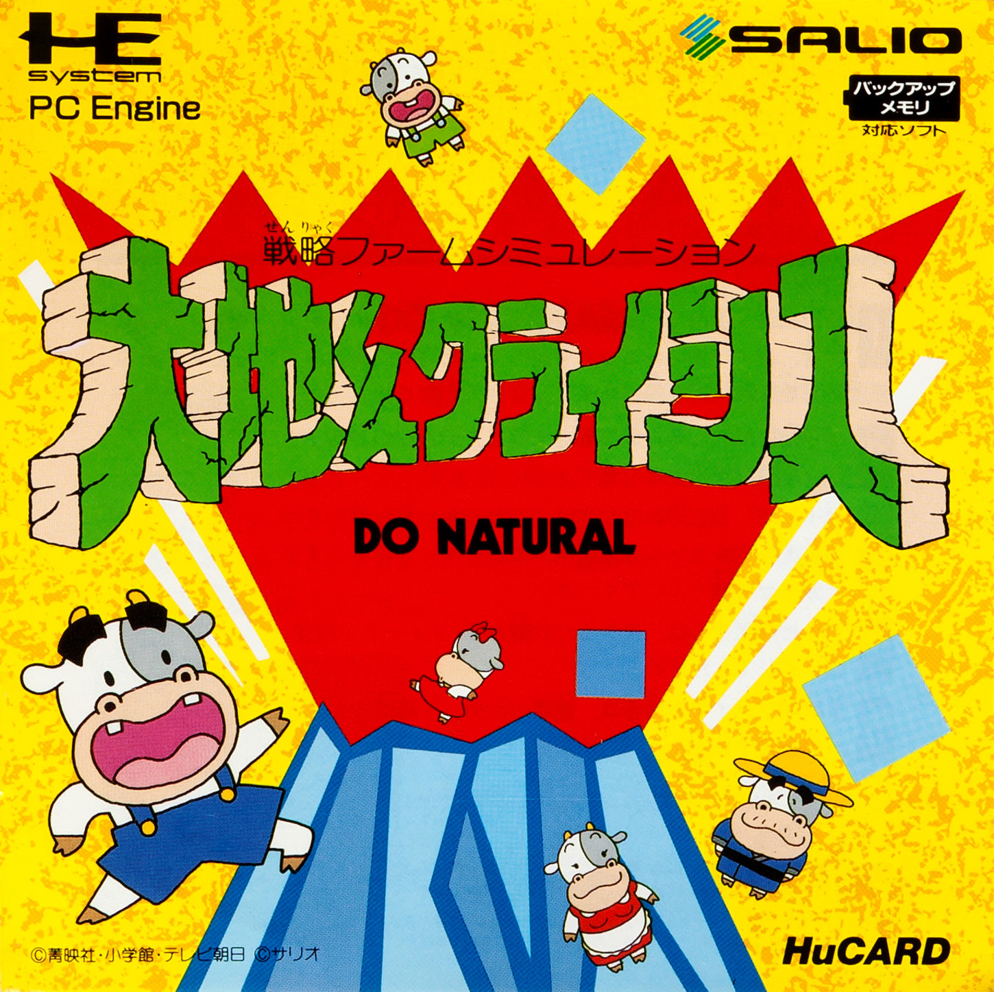 Daichikun Crisis: Do Natural is a 1989 PC Engine game that follows a family of cow anthropomorphs as they cultivate their home of Moo Cow Island. It uses a real-time strategy format where players explore the island and plant various crops. They must also fight off the occasional monster attack from the nearby volcanos, and clear the resulting toxic ash away.