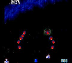 Later in the game some enemies are equipped with armor that renders them invincible while in formation. When one of these enemies starts its dive, it will flip over and expose its vulnerable side, then flip over again and become invincible while it moves back up the screen, then flip one more time and finish its dive. While vulnerable, this enemy can be destroyed in one hit, scoring bonus points. In addition, many different kinds of obstacles appear throughout the game, including blue crystals, boulders and green blobs.