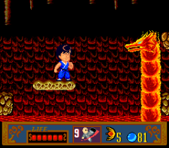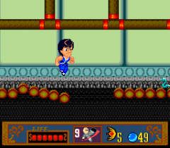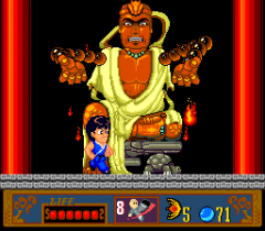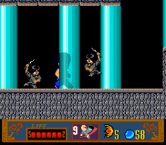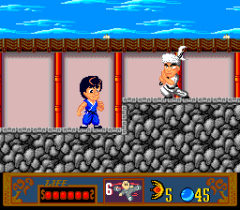 Jackie Chan's Action Kung Fu is a side-scrolling fighting game. Jackie's controls are one button to jump and another one to attack or be used in combination with a direction for a special attack. On his quest, Jackie must punch and kick his way past frogs, ninjas, birds and other enemies. Jackie can acquire special-moves such as the Tornado attack, the 180 degree spin kick, the 360 degree spin kick and the Sky Attack. Other power-ups include energy refills and bonus points.