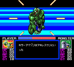 Monster Pro Wrestling is an unusual wrestling game by Tonkin House. Ever wondered how good muscled mutant monsters would do in a wrestling ring? Monster Pro Wrestling can certainly give you some answers. As the title implies, Monster Pro Wrestling is about professional wrestling and monsters. In 1999, humanity lives in underground cities and the evil Belzebuth sends his demon wrestlers to affront humans. Doctor Yamato takes on the challenge and creates mutant wrestlers to win the tournament (this is, however, what can be understood from the game's manual). The player first selects a champion from a list including wrestlers such as Fly Man, Zombie Man or Poison Man. Then, it is time to meet the mad scientist who can train and assist the fighter, and in the mutant laboratory, the wrestler can be tuned up using power points. Thirty points are available at the start and can be distributed across various attributes such as health or strength. It is now time to get our mutant straight to the ring and call another mutant wrestler to challenge him. However, Monster Pro Wrestling has an unusual way to display and manage each match. A number randomly loops on screen and the player must hold the attack button and pick a number. This becomes our mutant's Attack Power for the current round. The wrestler can then attack only if the opponent picks a lower Attack Power. Either ways, the stage that follows is pure frantic finger bashing action which either affects the strength of the coming attack, or the resulting escape move. Fairly large (and often funny) animated sequences show the outcome of the round and the game moves forward until one of the wrestler wins the match. If victorious, the mutant gains an upgrade and then gets ready for another ferocious match.