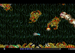 The R-9 comes equipped as standard with a small gun which can only take down the smallest of enemies without firing several shots. By holding down the fire button, it can be loaded up so as to release a large burst of energy, eliminating all but the strongest enemies in its path. From time to time, pods will come flying in your direction. Upon being shot, they release an upgrade. The first one will invariably be the one called "The Force", which is a weapons pod that clings either to the front or the back of your ship, absorbing any enemy bullets or acting as a bumper with which you can fly head-on into them. You can also use it as an offensive weapon by firing it and pulling it back in. Mastering the Force is vital to surviving in R-Type, since it must be used both as protection against bullet clusters, as a remote controlled cannon, and in order to clear the screen from obstacles. Other upgrades give you target-seeking missiles or a bigger main gun. Different gun types, differentiated by their colour, serve different purposes. The blue one sends laser beams bouncing across the screen (good for tunnels), the red one fires straight ahead, and the yellow one follows any walls it may encounter (good for artillery emplacements).
