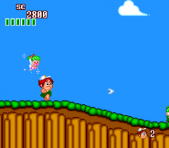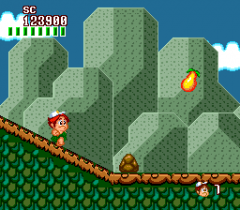 As you progress further, your vitality will get low, so fruit must be collected in order to restore it. Along the way, you can smash open eggs that will award you with better weapons that include boomerangs, arrows, and magical fire. Some of the eggs will also reveal a fairy, which will protect you from getting hit. If you are unlucky enough to find an eggplant hidden in one of these eggs, your vitality will drain away very fast, and you need to get fruit every five seconds in order to survive.