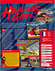 Heaven's Gate is a 3D fighting game with an arcade and Vs. mode. The player can choose from one of the eight combatants that are available at the start, with a few more characters being available once their unlocked. Each character has a different nationality, specialty, and lineage. Each character represents either a good or an evil alignment and depending on the character chosen, it affects which final boss the player will have to fight against.