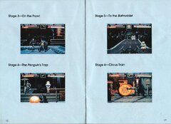 There are two varieties of the beat'em'up levels. One plays like Final Fight and similar games: Batman can move in two dimensions, beating up his enemies with various punches, kicks, combos and special moves. Special gadgets to be used include the famous Batarang to take out enemies from a distance and "Test Tubes" filled with chemical explosives which will damage all enemies on the screen.