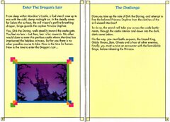 From deep within Mordroc's Castle, a foul stench rose up to mix with the cold, damp midnight air; the telltale sign of the evil wizard's pet fire-breathing dragon, Singe; the beast that guarded the Princess Daphne in the deadly caves far below the surface. Dirk the Daring walked steadily toward the castle gate. He felt no fear; but then fear was for cowards. No other would dare to enter this perilous castle where Mordroc had imprisoned the helpless princess. But for Dirk there was no other possible course to take. Now was the time for heroes. Now was the time for action. Now was the time to enter the Dragon's Lair...