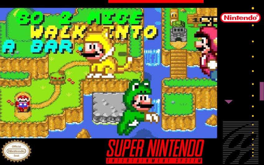 "So 2 Mice Walk Into a Bar..." is not a sequel to that. There is no JUMP Team here. In fact, we hate JUMP Team now. This is instead a spiritual successor which focuses on the most fun aspect of "stick mice..." (quickly designed levels focused around an ASM gimmick of sorts) without the limitations of "stick mice..." (begone sole C3 resources!).