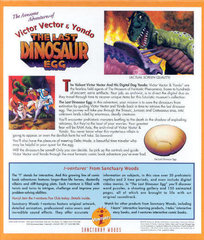 One of a series of fully interactive comic book adventures for kids where you play as the heroic Victor Vector and his digital Saint-Bernard dog Yondo. They are field agents of The Museum of Fantastic Phenomena, and travel through time collecting unique items. In the games, the arch-villain Ram Axis, a virus spawned in the great crash of 2093, will often pop up in disguise in order to prevent their efforts. Players explore a virtual environment by clicking on the onscreen knobs and directional controls to move through the game. They click on images to talk to people, collect treasure and other items that may boost or diminish their energy level or are needed to solve puzzles. Information can also be retrieved from Yondo's data bank collar. In this episode, your mission is to retrieve the last dinosaur egg in order to save the dinosaurs from extinction. You will go to the Triassic, Jurassic, and Cretaceous eras, where you'll see gigantic prehistoric creatures fighting each other while volcanoes erupt around them. In the journey you will also learn interesting information on prehistoric times and animal life. Another time traveler you will meet, named Delta Mode, can also be helpful in your search for the egg.