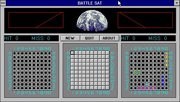 Battle Sat is a shareware clone of the classic Battleship board game. However, here the conflict has left the oceans and has instead gone to the skies above.The player takes turns against the computer's AI in a race to destroy the opponent's Sats (or Satellites). Gameplay is very similar to the classic Battleship - There are three grids on the screen: The left grid shows your opponent's playfield and tells you if you've hit one of his Sats, or if you missed. The middle grid allows you to choose what area you will attack during your turn. The right grid displays your own Sats, their status, and the places where the opponent has already attacked. This continues until one side loses all their Sats.The main difference between the Battleship board game and this Windows-based implementation is that there are five Sat pieces in play, all different sizes. While the board game has two pieces that are two blocks in size, this version contains one piece that's two blocks in size, and one piece that's one block in size.