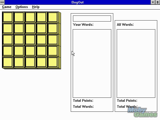 BogOut is a game based on the classic board game Boggle. Random letters are placed on a 5X5 or 4X4 grid and you try to get as many words as possible in the time allotted. Words must be at least 4 letters long and the longer your word is the more points you get for it. When the time is up you are shown all the words that were possible and how many points you got. You can play on a 4X4 or 5X5 grid, and you can add or delete words from their dictionary. One of the coolest features off BogOut is the multiplayer mode. By pressing restart game after you finish one round you can compare scores with friends and family.