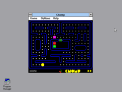 This is a simple Pac-Man clone for Windows featuring graphics, sound, levels, ghosts and bonus fruits extremely reminiscent of the real thing. Gameplay is familiar û players gobble dots for points, dodge ghosts (unless one of the special dots has been obtained that allows them to be eaten) and catch fruit for bonus points. The game encourages improvement and competition by storing five high scores. Speed is adjustable by means of an "animation delay" number between 0 and 999.