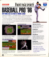 Whether you play as a manager, coach or player, Front Page Sports: Baseball Pro '96 Season offers detailed gameplay for each type of player. It has every MLB player and their most up-to-date stats as of 1996. Baseball Pro '96 season provides physics-based game play for total realism in ball-spin, air friction, etc. You can play in any of the 28 3D rendered major league parks. By setting the playing modes, you can decide whether you or the computer will control the managing, pitching, fielding, batting or baserunning. Gameplay can be controlled by using the joystick or keyboard.