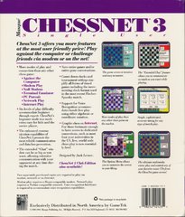 Masque ChessNet 3 is version 3 of Masque's chess program.This version of ChessNet has options that allow the player to compete with other players via modem, null modem, BBS terminal Emulator, PC Pursuit Dial up, Network or Internet connections. Alternatively the player can play against the computer and in such matches can choose any of six levels of difficulty. It has a help function, based on the US Chess Federation rules, which explains the game and a feature that allows players to listen to their own CD's while playing.The game comes loaded with 20 games from the 1993 World Chess Championship. The game can be played entirely by the mouse, dragging and dropping pieces. However the keyboard is needed when entering players' names and when typing messages to other players. There are also keyboard shortcuts to some of the game's menu options such as save, load, hints e.t.c.
