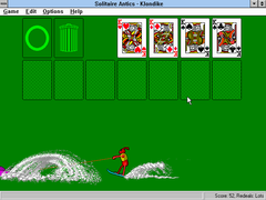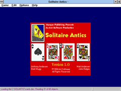 Masque Solitaire Antics is a compilation of single player card games that was later added to and released as Solitaire Antics Deluxe .The collection contains the following solitaire games; Royal Family, Ant's Solitaire, Aces Out, Aces Up, Agnes, Auld Lang Syne, Calculation, Canfield, Carpet, Chamelion, Demon, Double or Quits, Easthaven, Fascination, Fortune's Favor, Golf, Klondike, Simplicity, Storehouse, Thumb and Pouch and Yukon. Each game has its own help screen which explains the rules, and can be played in three levels of difficulty: normal, easier or harder.When loaded the game will start at a random game which the player can either play or choose another game from the collections menu. All card games are played using the mouse.At some points during the game, notably when a game ends, an animated ant appears on-screen.