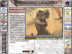 Prehistoric Animals is an educational game that explains a lot about prehistoric life during the Precambrian, Paleozoic, Mesozoic and Cenozoic eras. The game features hundreds of different prehistoric creatures from over ten different prehistoric time periods. There are illustrations, articles, real pictures, and even videos.The game has five different sections for articles and videos. They include "Introduction", "Early Life", "Rise of Vertebrates", "Fossils" and "Display". It also has 10 sections to view classified groups of prehistoric species going in evolution order including Protomammals, Flying Reptiles and Ornithischian Dinosaurs.You can look up a prehistoric creature through the database, print an article, look up an article in the index, and you can even take a quiz on different chapters. A score is shown during the quiz, but there is no difficulty level or support for highscores.