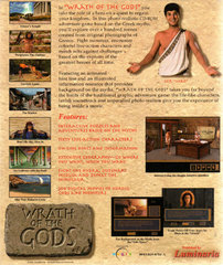 A centaur found a baby abandoned on a mountainside, took him, and raise him as his own. When the baby becomes a young man, the centaur reveals to him that there was a ring and a few gems in his baby blanket. This can only mean that he is of no ordinary origin, and is probably connected to the gods. The young man leaves the centaur's house, determined to find his real parents, and learn about his heroic destiny.Wrath of the Gods is a puzzle-solving adventure game revolving around popular Greek myths. Many of the puzzles can be solved by applying knowledge of Greek mythology. To further emphasize the educational element, the game includes an database of Greek mythology, which can be used as a hint system to solving the puzzles, or purely for learning purposes. The game utilizes digitized photographs for characters and backgrounds, with third-person navigation.