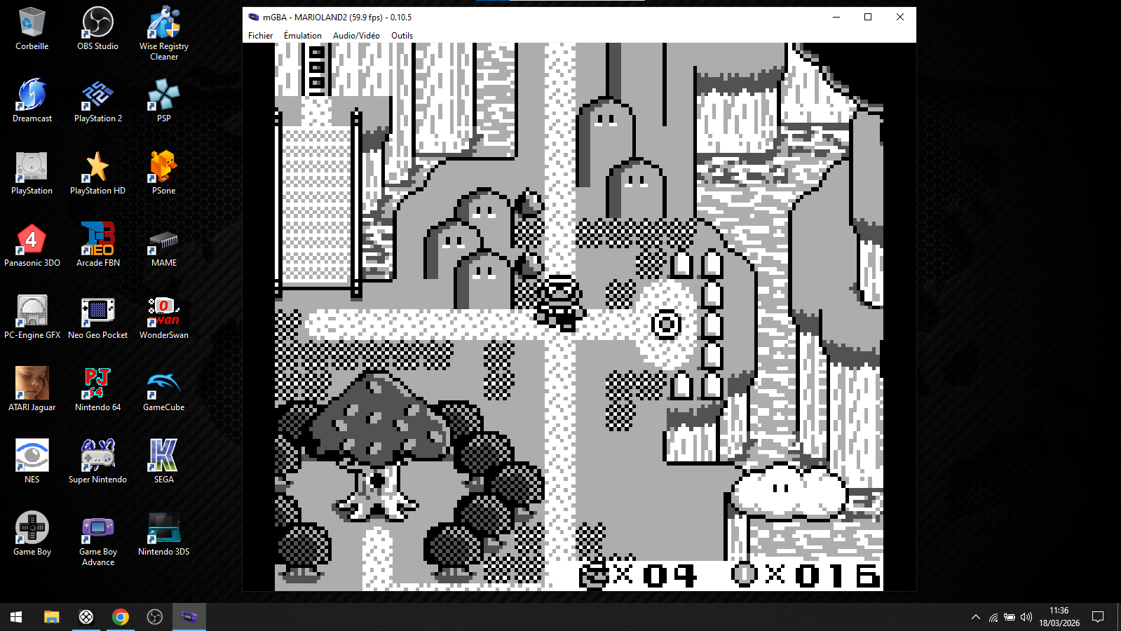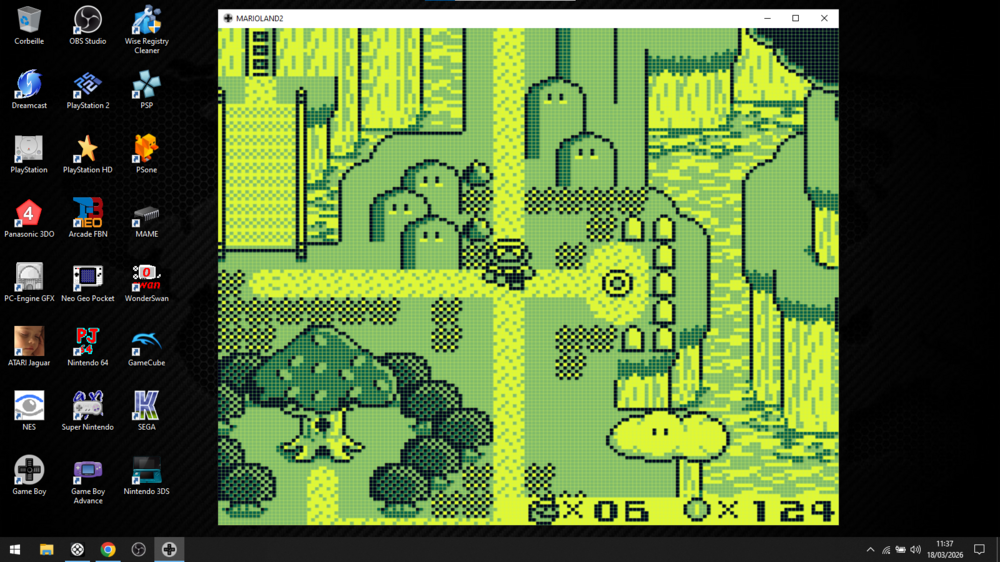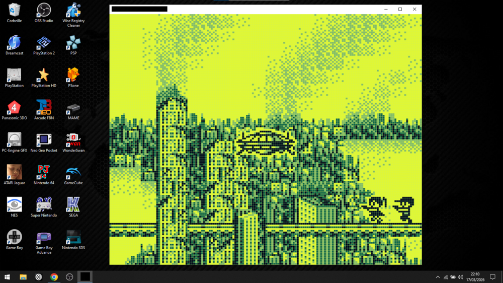Je vous mets ce screenshot car en ce moment je rédige un [TUTO] pour RomStation pour vous expliquer comment jouer au jeu GameBoy original en Dot Matrix avec tous les liens pour télécharger l’émulateur ainsi que la configuration de celui-ci pour avoir un rendu le plus proche possible de ce qu’était le rendu Game Boy. Je suis un très grand fan de la toute première Game Boy et rien ne me désole le plus que de voir un let’s play sur cette console en noir et blanc car la Nintendo Game Boy n’a jamais été en noir et blanc ! La Game Boy utilisait comme écran une Dot Matrix (matrice de points) et elle avait 5 nuances de vert allant du plus clair au plus foncé. Ce [TUTO] a pour objectif de vous faire jouer à la Game Boy de la façon la plus réaliste possible sur PC en utilisant l’aspect et les couleurs d’origine et croyez-moi, après ce [TUTO], vous aurez un grand sourire quand vous allez lancer un jeu Game Boy, et encore plus pour ceux qui ont connu et possèdent encore une Nintendo Game Boy car on va essayer de lui rendre ses lettres de noblesse car le rendu d’origine en Dot Matrix est incomparable.2 points