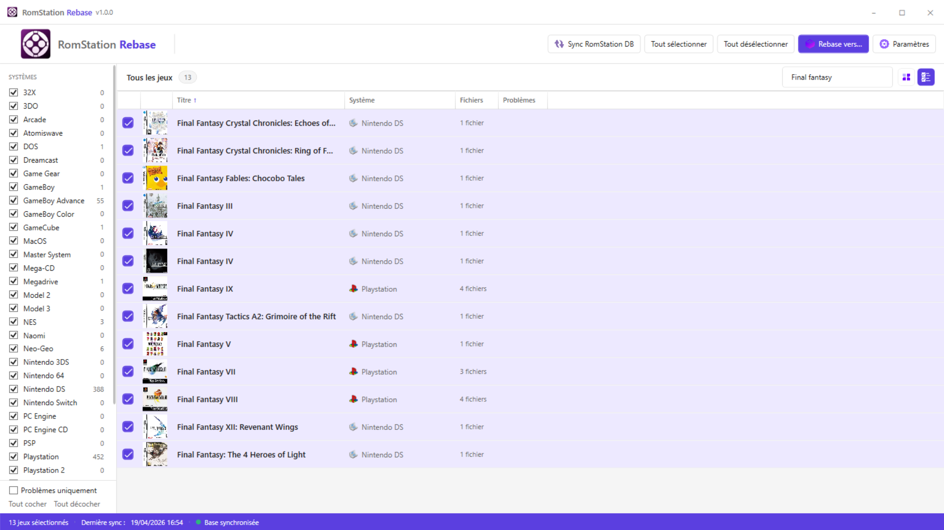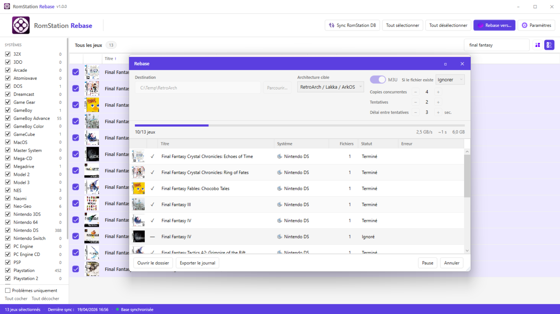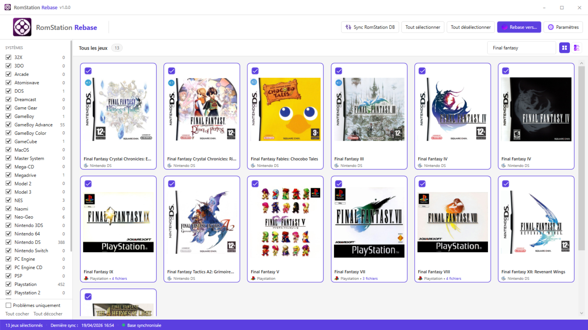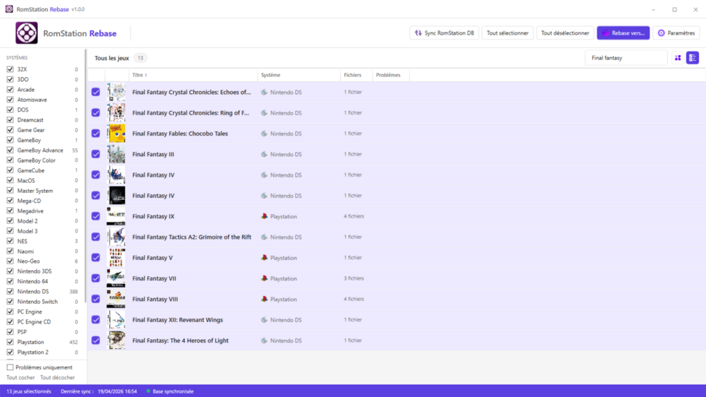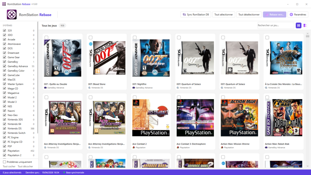 Bonjour à tous ! Je souhaite vous présenter mon outil nommé RomStation Rebase (Open Source en C#) que je viens de publier sur GitHub aujourd'hui même. L'idée m'est venue parce que je souhaitais me faciliter la vie pour transférer les roms télécharger par Romstation vers mes consoles type Anbernic ou système RetroArch (et bientôt la Ayn Thor 😛) - au début je voulais faire un simple script Powershell et me débrouiller comme ça mais je suis finalement parti sur un outil qui se base vraiment sur les données de RomStation (qui est donc une dépendance pour faire fonctionner mon outil). Si vous souhaitez le tester et me faire des retours (soit ici, soit par Github), n'hésitez pas ! J'espère qu'il saura bien vous servir ! Il peut être installé soit via un MSI soit en mode portable via un ZIP. Lien vers le projet RomStation Rebase : https://github.com/Letalys/RomStationRebase Lien vers la dernière Release : https://github.com/Letalys/RomStationRebase/releases/latest Amusez vous bien ! Ci dessous quelques captures d'écrans - Les jeux affichés et jaquettes sont issus de mes téléchargements RomStation.4 points